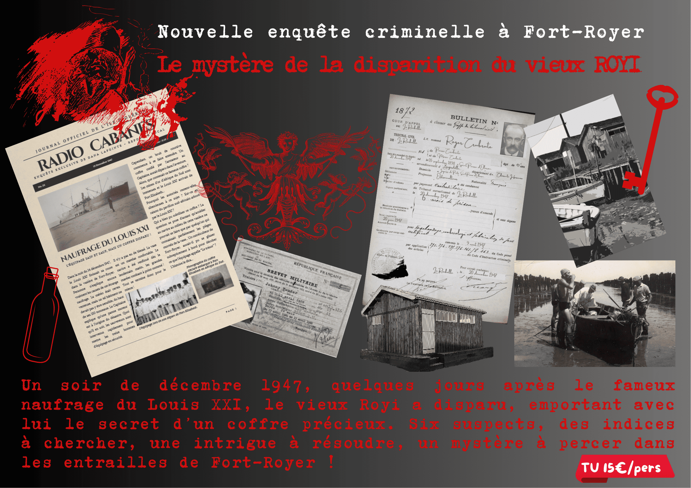 Un soir de décembre 1947, quelques jours après le fameux naufrage du Louis XXI, le vieux Royi a disparu, emportant avec lui le secret d’un coffre précieux. Six suspects, des indices à chercher, une intrigue à résoudre, un mystère à percer dans les entrailles de Fort-Royer !
